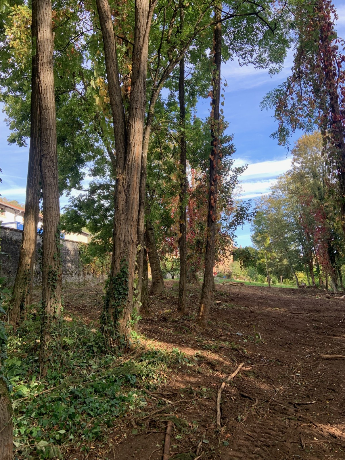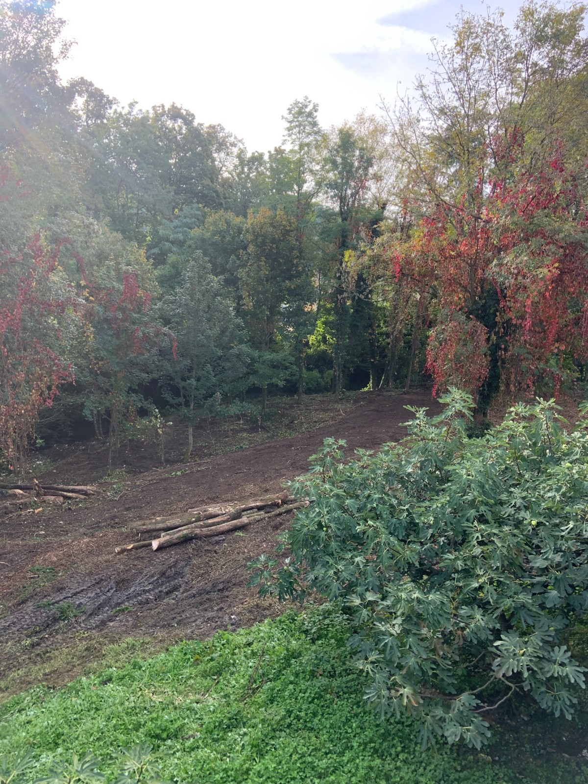 Grâce au broyeur à fléau, les ronces et les diverses plantes envahissantes ont été broyées, les arbres trop nombreux abattus et réduits en copeaux grâce au broyeur à branches, d'autres arbres ont été élagués par nos élagueurs professionnels, et les souches retirées par la mini pelle (processus de dessouchage traditionnel)...
