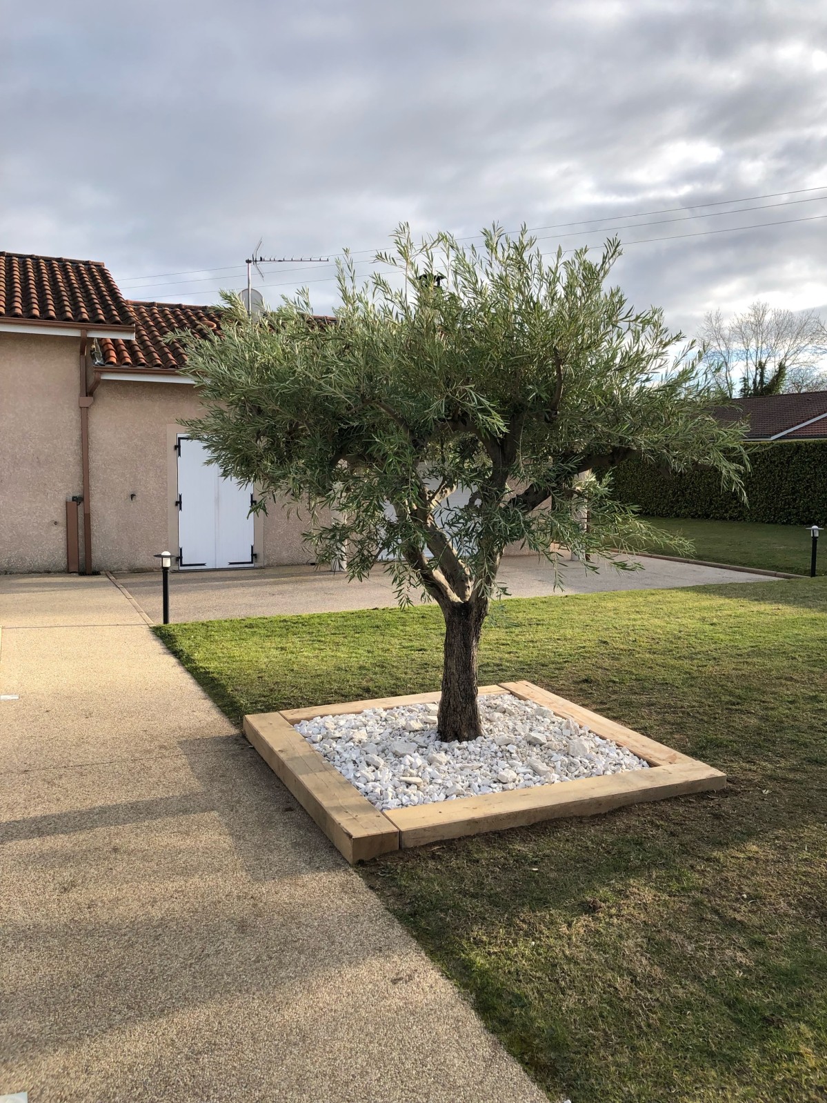 De magnifiques poutres de Chênes ont été posées autour de l'Olivier, avec du concassé beige pour mettre en relief et en valeur l'arbre.